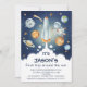 Cute space themed boy's any age birthday invitation featuring a spaceman, rocket-ship, planets and stars in deep outer space. Great for a boy's first trip around the moon first birthday invitation or for a blast off theme birthday.
