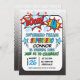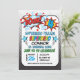This boy's superhero 4th birthday invitation is perfect for a four birthday parade during COVID. It features a large number, cartoon like words and elements on a white and black background.