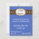 Western style boy's party invitation done, in a blue denim background, tan stitching, a brown belt looking stripe across the middle, with a silver looking western style belt buckle. Customize all the text fields to your needs, with text style, colour, and size.