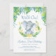 This safari theme 1st birthday invitation has the cutest baby elephant with blue polka dot ears. Surrounded by tropical foliage in green and blue you can easily personalise this invitation template with your child's first birthday details.