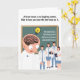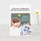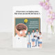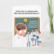A graphic illustration featuring a cartoon professor with his brain visible in his head having a light bulb idea while brainstorming how to tackle a brain tumour operation on a patient. The neurosurgeons and physicians are standing in a lecture room with a blackboard behind them on which the names of the four most common tumours appear. The words, a brain tumour is no laughing matter. Glad to hear you have the best team on it, appears on the outside and the inside has your own personalized message to convey your heartfelt sympathy and recovery wishes to a friend, loved one or work colleague.
