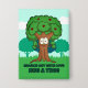 Branch Out With Love and Hug A Tree badge, pin, featuring a nature inspired scene of a funny happy tree with big goofy eyes and a wide friendly grin. The tree trunk is brown and the leaves are green dotted with red heart shaped apples. Below are two text templates in a chunky fun green font with a black stroke. One reading "Branch Out With Love" and the other reading " Hug A Tree" These can be used as they are or you can use the text templates to add your own text. The background is a simple nature scene with trees, grass and clouds. Ideal for tree lovers, nature lovers and a love for the environment.