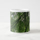 This awesome mug features a photograph taken from within a dense forest. The photograph shows the view of the sky through a tangled and beautiful web of tree branches and luscious green leaves.
