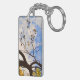 Des branches noires foncées se détachent contre le feuillage d'automne jaune et un ciel bleu avec des formations nuageuses intéressantes dans un motif abstrait sur ce porte - clé acrylique d'art.