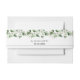 This elegant floral wedding invitation belly band showcases an arrangement of branches adorned with delicate white flowers and sage green leaves at the upper part. The names of the couple are prominently displayed in decorative typography, adding a touch of sophistication to the design. A black border at the bottom is adding a subtle yet stylish element to the overall aesthetic.