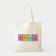 These bags were super cute (I purchased 3). The material is more of a canvas look & feel. The colour of the bag is slightly off white, but the letters look exactly as pictured. I took 3 photos in different lighting. Would recommend! I liked how there was an option to choose the font and colour of the name. The words are legible and the colours are exactly as pictured.