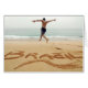 COPYRIGHT Stephanie Rabemiafara / DanitaDelimont.com | AF36 SRA0000.jpg | BRAZIL. Barechest man wearing a swimming suit jumping on the sand over the name Brazil written in the sand, jumping towards the sea