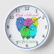 A bright and cheerful clock for a keen crocheter, decorated with fluffy, cute, woolly cartoon style sheep in bright colours - blue, pink, green, yellow and turquoise, with the words "Break out the wool, it's time to crochet" in handwritten fonts. It's perfect for a craft room.