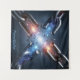 The breaking point reveals an explosion of bright blue and fiery orange energy, glowing with raw force and futuristic intensity. The interplay of light and shadow creates a bold, cinematic effect, drawing the viewer’s attention to the central X-shaped fracture.