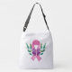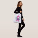 This cross-body tote bag is shown in a breast cancer awareness pink ribbon and butterfly art print.