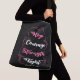This cross-body tote bag is shown in a breast cancer awareness hope courage art print.