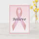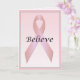 A graphic illustration of a pink breast cancer awareness ribbon greeting card. The card has the text "Believe" and text templates for your personalization.