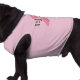 I was a bit leery about ordering this for our Bernese based on only "85 lbs plus" for the 3XL, but she needs sun protection until her fur grows back. When I opened the package I thought it looked really small but tried it anyway, and to my surprise it not only fit but fit well, with a bit of room to spare. The cut/pattern is good. The material is like a thin tee but that's all I wanted anyway. It arrived really quickly. The name is smaller than I thought but that may just be me misremembering. The printing doesn't really stand out on the grey shirt, but that's to be expected.