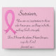 This breast cancer survivor plaques is made on a light pink texturel background with a pink ribbon as its focal point and bible scripture. Message "Survivor, vous êtes inspiré de those who know you... trahison en forfaitaire... seeking's strength de Dieu. Inclut bible scripture "For I know the plans I have for you, says the Lord. Jeremiah 29:11"