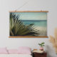 Secluded beach and ocean scene with palm tree leaves.