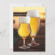 Wedding invitation featuring two beer glasses on a jetty at sunset. Beautiful for an outdoor or lake wedding with a beer theme or a brewery wedding. (If you prefer a plain dark wood background on the back, you can delete the beer image on the back.)