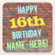 This fun birthday-themed coaster design features a message like "HAPPY 16th BIRTHDAY, NAME-HERE!", where the name can be personalized. The background features a representation of a brick wall consisting of some reddish-brown coloured bricks. The customizable message text features colours like blue, yellow, and green, and it has an appearance inspired by that of painted graffiti. Coasters like these might be useful as practical decorations at a birthday party for somebody who is celebrating their sixteenth birthday. [~Z0000288]