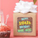 This fun birthday-themed sticker design features a message like "HAPPY 16th BIRTHDAY, NAME-HERE!", where the name can be personalized. The background features a representation of a brick wall consisting of some reddish-brown coloured bricks. The customizable message text features colours like blue, yellow, and green, and it has an appearance inspired by that of painted graffiti. Stickers like these could perhaps be given as a birthday gift, or perhaps be used as decorations at a birthday party for somebody who is celebrating their sixteenth birthday. [~Z0000273]