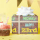 This fun birthday-themed wrapping paper design features a message like "HAPPY 23rd BIRTHDAY, MICHAEL!", where the name can be personalized. The background features a representation of a brick wall consisting of some reddish-brown coloured bricks. The customizable message text features colours like blue, yellow, and green, and it has an appearance inspired by that of painted graffiti. Wrapping paper like this could perhaps be used when wrapping birthday gifts being given to somebody who is celebrating their twenty third birthday. [~Z0000274]