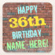 This fun birthday-themed coaster design features a message like "HAPPY 36th BIRTHDAY, NAME-HERE!", where the name can be personalized. The background features a representation of a brick wall consisting of some reddish-brown coloured bricks. The customizable message text features colours like blue, yellow, and green, and it has an appearance inspired by that of painted graffiti. Coasters like these might be useful as practical decorations at a birthday party for somebody who is celebrating their thirty sixth birthday. [~Z0000288]