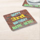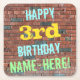 This fun birthday-themed coaster design features a message like "HAPPY 3rd BIRTHDAY, NAME-HERE!", where the name can be personalized. The background features a representation of a brick wall consisting of some reddish-brown coloured bricks. The customizable message text features colours like blue, yellow, and green, and it has an appearance inspired by that of painted graffiti. Coasters like these might be useful as practical decorations at a birthday party for somebody who is celebrating their third birthday. [~Z0000288]
