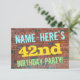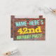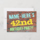 This fun birthday party invitation design features a message like "NAME-HERE’S 42nd BIRTHDAY PARTY!", where the name can be personalized, on the front. The background features a representation of a brick wall consisting of some reddish-brown coloured bricks. The customizable message text on the front features colours like blue, yellow, and green, and it has an appearance inspired by that of painted graffiti. The back features a customizable message that could include relevant details about the birthday party. Birthday party invitations like this might be a fun way to invite family and friends to a birthday party being held for somebody who is celebrating their forty second birthday. [~Z0000287]