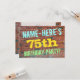 This fun birthday party invitation design features a message like "NAME-HERE’S 75th BIRTHDAY PARTY!", where the name can be personalized, on the front. The background features a representation of a brick wall consisting of some reddish-brown coloured bricks. The customizable message text on the front features colours like blue, yellow, and green, and it has an appearance inspired by that of painted graffiti. The back features a customizable message that could include relevant details about the birthday party. Birthday party invitations like this might be a fun way to invite family and friends to a birthday party being held for somebody who is celebrating their seventy fifth birthday. [~Z0000287]