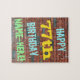 This fun birthday-themed puzzle design features a message like "HAPPY 77th BIRTHDAY, NAME-HERE!", where the name can be personalized. The background features a representation of a brick wall consisting of some reddish-brown coloured bricks. The customizable message text features colours like blue, yellow, and green, and it has an appearance inspired by that of painted graffiti. A puzzle like this might be used as a fun way to send birthday wishes to somebody who is celebrating their seventy seventh birthday, and who perhaps really likes doing puzzles. [~Z0000285]