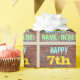 This fun birthday-themed wrapping paper design features a message like "HAPPY 7th BIRTHDAY, NAME-HERE!", where the name can be personalized. The background features a representation of a brick wall consisting of some reddish-brown coloured bricks. The customizable message text features colours like blue, yellow, and green, and it has an appearance inspired by that of painted graffiti. Wrapping paper like this could perhaps be used when wrapping birthday gifts being given to somebody who is celebrating their seventh birthday. [~Z0000274]