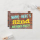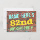 This fun birthday party invitation design features a message like "NAME-HERE’S 82nd BIRTHDAY PARTY!", where the name can be personalized, on the front. The background features a representation of a brick wall consisting of some reddish-brown coloured bricks. The customizable message text on the front features colours like blue, yellow, and green, and it has an appearance inspired by that of painted graffiti. The back features a customizable message that could include relevant details about the birthday party. Birthday party invitations like this might be a fun way to invite family and friends to a birthday party being held for somebody who is celebrating their eighty second birthday. [~Z0000287]