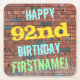 This fun birthday-themed coaster design features a message like "HAPPY 92nd BIRTHDAY, FIRSTNAME!", where the name can be personalized. The background features a representation of a brick wall consisting of some reddish-brown coloured bricks. The customizable message text features colours like blue, yellow, and green, and it has an appearance inspired by that of painted graffiti. Coasters like these might be useful as practical decorations at a birthday party for somebody who is celebrating their ninety second birthday. [~Z0000288]