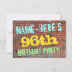 This fun birthday party invitation design features a message like "NAME-HERE’S 96th BIRTHDAY PARTY!", where the name can be personalized, on the front. The background features a representation of a brick wall consisting of some reddish-brown coloured bricks. The customizable message text on the front features colours like blue, yellow, and green, and it has an appearance inspired by that of painted graffiti. The back features a customizable message that could include relevant details about the birthday party. Birthday party invitations like this might be a fun way to invite family and friends to a birthday party being held for somebody who is celebrating their ninety sixth birthday. [~Z0000287]