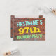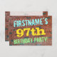 This fun birthday party invitation design features a message like "FIRSTNAME’S 97th BIRTHDAY PARTY!", where the name can be personalized, on the front. The background features a representation of a brick wall consisting of some reddish-brown coloured bricks. The customizable message text on the front features colours like blue, yellow, and green, and it has an appearance inspired by that of painted graffiti. The back features a customizable message that could include relevant details about the birthday party. Birthday party invitations like this might be a fun way to invite family and friends to a birthday party being held for somebody who is celebrating their ninety seventh birthday. [~Z0000287]