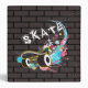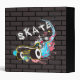 A grunge splatter paint skateboard scene in pastel colours with a brick wall background and the word "SKATE" written on the wall in graffiti style.