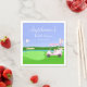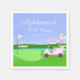 This golf-themed bridal shower napkins is crafted with the bride-to-be at the heart of its design. It features a heart-shaped putting green and a flag pin fluttering in the breeze, emblazoned with the words "Bride to Be." The golf cart is festively adorned with champagne, gifts, a tiara, and an intricately illustrated bridal shower cake. A bridal veil elegantly drapes from the golf bag, adding a charming touch. Designed by Daphsam, this one-of-a-kind napkins comes with an easy-to-use template to ensure stress-free planning.