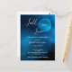 A romantic invite card for a rustic bridal shower . A dark blue evening and night with a full moon. With the text: Fall in Love. Templates for date, name, event place, and RSVP details. The name is written with a modern hand lettered style script. White letters.