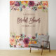 This stunning rustic bridal shower photobooth backdrop features trendy watercolor flowers in shades of marsala, burgundy, blush pink, and orange, with green leaves. The background is a tan, kraft paper look and trendy handwritten script adds an extra stylish touch.