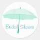 Pretty bridal shower envelope seal made using a round shape sticker, in a white background, with graphics of a aquamarine coloured umbrella and aqua coloured text reading Bridal Shower. Personalize the text to suit your party needs. Great for bridal or baby showers.