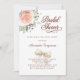A chic white background. Decorated with a rose gold and blush pink floral, rose flower, greenery and a bow. Personalize and add the name of the bride to be and party details.