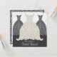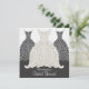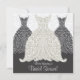Stylized lacy bridal gown and bridesmaid dresses in white, black and Platinum. Customize with your own text. Original illustration by pj_design. Bridal Invitation features a highly stylized lacy wedding dress and bridesmaid gowns decorated with lovebirds, vines, and berries. Decorated with a damask pattern background.