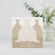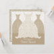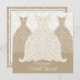 Stylized lacy bridal gown and bridesmaid dresses in white and taupe. Customize with your own text. Original illustration by pj_design. Bridal Invitation features a highly stylized lacy wedding dress and bridesmaid gowns decorated with lovebirds, vines, and berries. Decorated with a damask pattern background.
