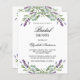 A white background. Decorated with violet lavender flowers and eucalyptus greenery. Personalize and add a name and party details. The name is written with a hand lettered style script.