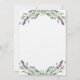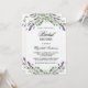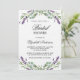 A white background. Decorated with violet lavender flowers and eucalyptus greenery. Personalize and add a name and party details. The name is written with a hand lettered style script