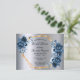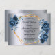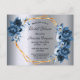 On front: A glamourous faux silver metallic looking background with a faux gold geometric shaped frame. Decorated with navy blue and shades of blue watercolored flowers, roses. Templates for the name of the bride and party details. The name is written with a hand lettered style script, black coloured letters. Pefect for a winter bridal shower.