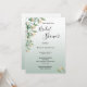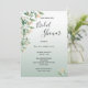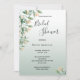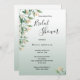 On front: Botanical theme. Sage green gradient, ombre background. Decorated with greenery, sprigs and foliage with small golden flowers. Modern large hand lettered script, typography with the text: Bridal Shower. Templates for the bride to be's name and party details. Black text.