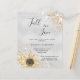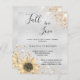A modern, elegant and bridal shower. A faux silver looking background decorated with faux gold and silver glitter dust and a rustic sunflower. Personalize and add a name and party details. Black coloured letters. With the text: Fall in Love