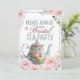 An elegant bridal shower tea party invitation with pink rose flowers and a vintage teapot on the front with a stack of vintage teacups on the back in shades of pink and teal. Customize with your event's name on the front and personalize the back with the bride's name, time and date of the event, location and contact details for RSVPing.