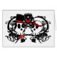 A skull in a black top hat and red bow tie with a skull wearing a red flower headband, surrounded by black vines with a red heart between them. Great for a Halloween themed wedding or a goth wedding.