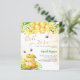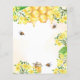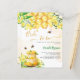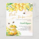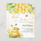 A stylish white and golden watercolored background. Decorated with bumble bees, melting honey and honeycomb with yellow florals, flowers and a wedding cake with lemons. With the text: Bride to bee written with a modern hand lettered style script. Personalize and add the name of the bride to bee.