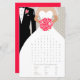 Elegant graphic groom with tux and bride with veil holding a posy of red stylized roses floral bridal shower word search game. Bridal shower party guests are requested to find the wedding-related words in this fun wedding dress-styled word search. An easy game that is good to use as a gift game offering a prize gift to the person finishing first. Unique design and graphic art by Sarah Trett for www.mylittleedenweddings.com